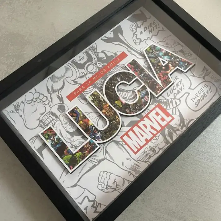 Creamos una pieza única, personalizada con tu nombre o el de quien tú quieras, y ambientada con detalles inspirados en los héroes del universo Marvel.